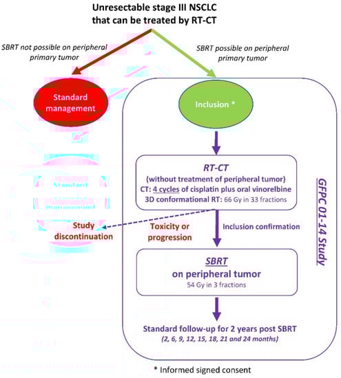 Patients were included after completion of RT-CT (Figure 1). The main inclusion criteria were: age ≥ 18 years; ECOG (Eastern Cooperative Oncology Group) performance status (PS) 0–1; histologically proven NSCLC; unresectable stage III, i.e., T1 or T2 or T3 ≤ 5 cm and N2 or N3 (only contralateral mediastinum or homolateral supraclavicular); peripheral primary tumor ≥1 cm and ≤5 cm; patients eligible for RT-CT; adequate biological parameters; forced expiratory volume (FEV) ≥1 L or ≥30% of the theoretical value. The main exclusion criteria were: small cell or large cell neuroendocrine carcinoma, metastatic disease, resectable tumor.