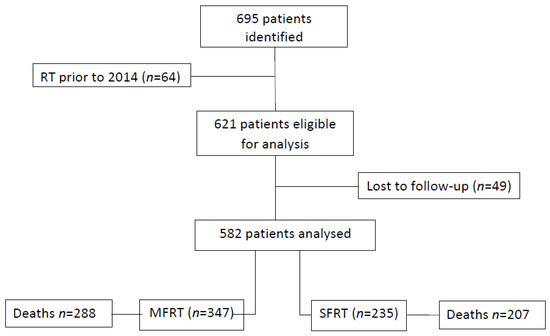 After excluding the patients with at least one radiotherapy course for bone metastases prior to 2014 (64 patients), and patients lost to follow-up (49 patients) a total of 582 patients remained in the study—347 patients in the MFRT group and 235 patients in the SFRT group (Figure 1). The patients included in the study underwent either a single irradiation sequence (498 patients) or several irradiation sequences on different anatomic regions (84 patients), in which case the first irradiation was considered for the OS analysis. For the treatment pattern analysis, we took into account the total number of radiotherapy courses performed, which was 677, considering the 84 patients who underwent multiple irradiations. In this way, for each radiotherapy course we could differentiate between several clinical characteristics that changed from one radiotherapy course to another for the same patient (e.g., age, PS, irradiated site).