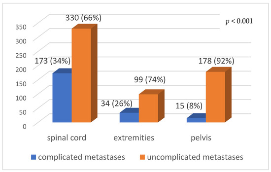 The frequency of complications differed depending on the metastatic site. Spinal metastases were complicated in 34% (173/503) of cases, whereas pelvic lesions had only 8% (178/193) complications (p < 0.001) (Figure 2).
