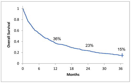 The median survival in our group of patients was 7.3 months, similar to Willeumier et al. [21], but far lower than the survival reported by other authors—14 months [22]. On the other hand, we obtained similar results to other studies regarding OS rates. In this respect, Katagiri et al. reported identical OS rates with the ones we obtained 36%, 23% and 16% [4], whereas Kubota et al. obtained lower OS rates at one and two years: 23% and 13% [23]. The survival differences between the studies can be attributed to a different selection of patients and their variable clinical characteristics.