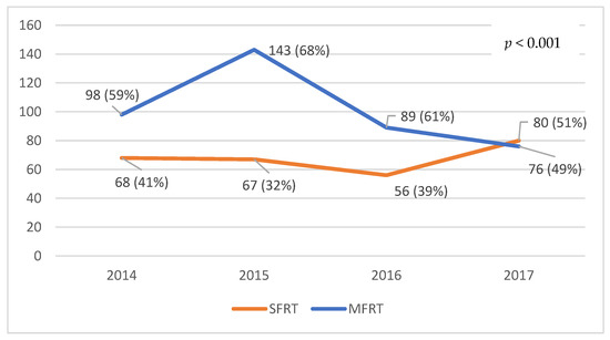 A total of 677 irradiations were performed on the 582 patients included in the study. The overall proportion of SFRT between 2014 and 2017 was 40% (271/677). The ratio of SFRT irradiation varied in the analyzed time interval (Figure 4). There was an increase of SFRT prescription from 41% (68/166) in 2014 to 51% (80/150) in 2017 (p < 0.001). In the 84 patients undergoing multiple irradiations on different sites, if the first irradiation was MFRT, the second one was more likely to be MFRT as well: 73% (39/53 patients) compared to 27% (14/53 patients) SFRT. Moreover, of the patients who initially received SFRT, 52% (16/31 patients) received MFRT at their second irradiation (p = 0.04).