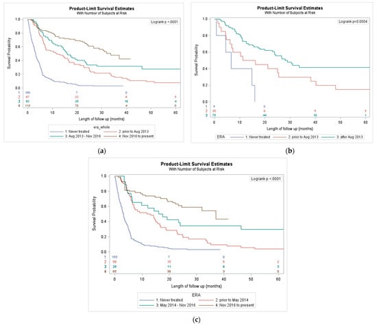 Based on dates of drug availability, we defined three eras for the total population: prior to August 2013, August 2013–November 2016, and after November 2016. We assessed overall survival outcomes based on these eras and compared it to a cohort who never received treatment.