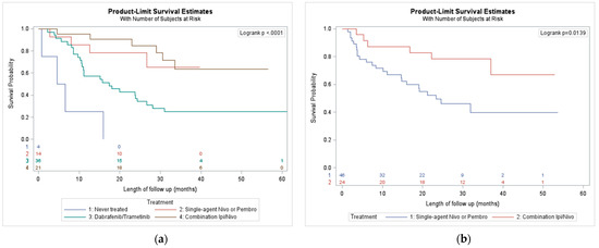 (a) Overall survival outcomes by first treatment received of BRAF mutation positive; (b) overall survival outcomes by first treatment received, in BRAF wild type/Unknown.