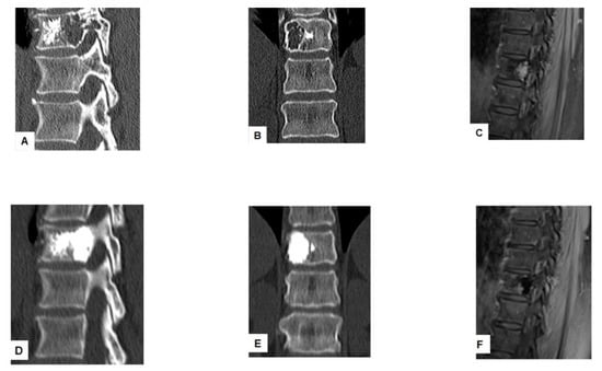- Wallace, A.N.; Tomasian, A.; Vaswani, D.; Vyhmeister, R.; Chang, R.O.; Jennings, J.W. Radiographic Local Control of Spinal Metastases with Percutaneous Radiofrequency Ablation and Vertebral Augmentation. AJNR Am. J. Neuroradiol. 2016, 37, 759–765. [Google Scholar] [CrossRef] [PubMed]
