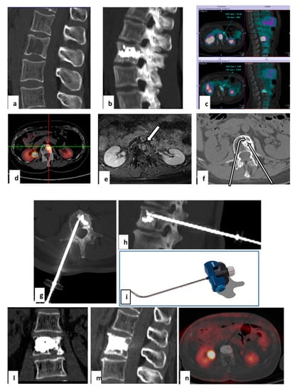 Treatment with tRFA and VA of a recurrent metastasis in a 57-year-old woman with a single L2 lytic metastasis from breast cancer. The metastasis had been treated previously with microwave ablation. Sagittal CT reconstruction showed a large lytic metastasis of L2 treated with microwave ablation (a). Sagittal CT obtained with MIP technique demonstrated the results of vertebral augmentation (b). PET-FDG performed before and 4 months after treatment demonstrates complete absence of metastasis uptake (c). Vertebral tumor recurrence 12 months after the microwave ablation treatment. FDG-PET demonstrated intense uptake of the vertebral body, anterior to the cemented area (d). T1 MRI with fat suppression acquired after gadolinium infusion revealed an area of contrast enhancement related to recurrence (e). Cement interposition hindered access to metastasis by left transpeduncular route with straight needle (straight arrow). The lesion can be reached by contralateral transpeduncular approach with a steerable needle (tSTAR) (f). Axial and coronal CT scans reconstructed with MIP technique (g,h) after tRFA navigation system placement (i). Coronal and sagittal CT scans after treatment of the second vertebroplasty (l,m). PET-FDG performed after 6 months demonstrates absence of metastasis uptake (n).