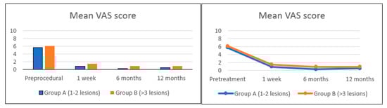 Evaluation of VAS score in symptomatic patients across Group A and Group B, before tRFA, 1 week, 6 months, and 12 months after tRFA.