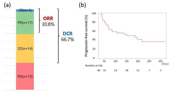 (a) Treatment response to atezolizumab + bevacizumab combination therapy (CR, complete response; PR, partial response; SD, stable disease; PD, progressive disease; ORR, objective response rate; DCR, disease control rate). (b) Progression-free survival of all 40 patients.