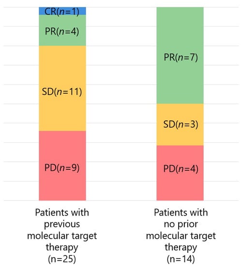 Figure 2 shows the response rate of Atezo/Bev according to the presence or absence of prior molecular-targeted therapy. Of the 25 patients with previous molecular-targeted therapy, the ORR and DCR were 20.0% (5/25) and 64.0% (16/25), respectively, with 1, 4, 11, and 9 patients experiencing CR, PR, SD, and PD, respectively. Of the 14 patients with no prior molecular-targeted therapy, the ORR and DCR were 50.0% (7/14) and 71.4% (10/14), respectively, with 0, 7, 3, and 4 patients experiencing CR, PR, SD, and PD, respectively. No significant difference was found in ORR and DCR between patients with and those without prior treatment with molecular-targeted agents (p = 0.052 and p = 0.637, respectively).