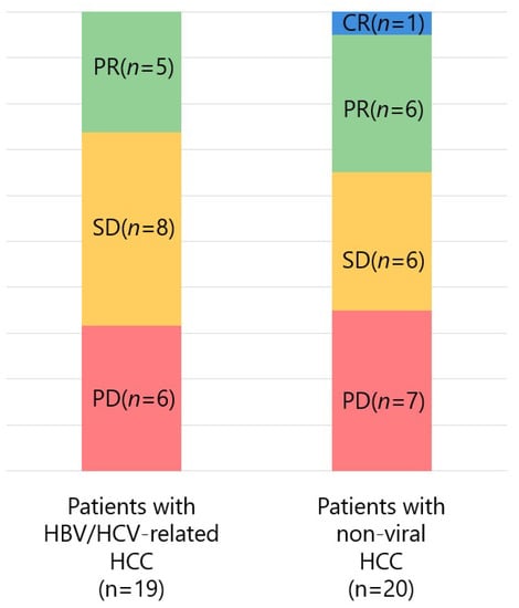 Response to atezolizumab + bevacizumab combination therapy in patients with hepatocellular carcinoma (HCC) caused by hepatitis virus infection and those with non-viral HCC (CR, complete response; PR, partial response; SD, stable disease; PD, progressive disease; HBV, hepatitis B virus; HCV, hepatitis C virus).