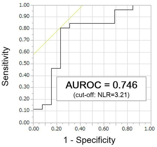 We performed ROC curve analysis on the cut-off value of NLR for predicting responses in order to further investigate the relationship between pretreatment NLR and the therapeutic efficacy of Atezo/Bev therapy. ROC curve analysis showed that the optimal cut-off value for NLR was 3.21 (sensitivity, 80.8%; specificity, 76.9%; AUROC, 0.746; Figure 4).