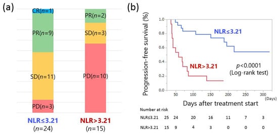 (a) Comparison of response to atezolizumab + bevacizumab combination therapy in pretreatment low neutrophil-to-lymphocyte ratio (NLR) and high NLR groups (CR, complete response; PR, partial response; SD, stable disease; PD, progressive disease). (b) Comparison of progression-free survival in the low and high NLR groups.