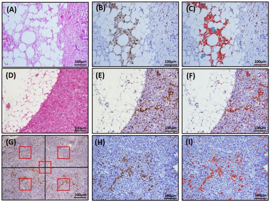 Representative image of CLS and TAMs by immunohistochemical staining for CD68 and ImageJ software-assisted images. (A,D,G), H&E staining; (B,E,H), IHC CD68 staining; (C,F,I), ImageJ images. In (C), note that there are two adipocytes completely surrounded by CD68-positive macrophages (arrows), counted as two CD68+ CLSs. (G) For TAM density, the area with the greatest concentration of CD68-stained TAMs was identified. Then, five fields (red box, four quadrants and a central area, each field contained 0.04 mm2) under 100× magnification were selected, and the number of CD68+ macrophages was counted under 200× magnification with the assistance of ImageJ software (I).