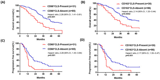 To further understand the possible prognostic role of ov-TAM, om-TAM and CLSs, as well as other clinical parameters, i.e., age, FIGO stage, and residual tumor status, a Cox regression analysis for OS and PFS was performed, as shown in Table 2 and Table 3. Based on the median as the cutoff value, we grouped all 116 patients into two groups with the presence or absence of omental CD68+ or CD163+ CLSs. Patients with omental CD68+ CLSs had poor OS (median survival: 24 vs. 38 months, p = 0.001, HR: 2.26, 95%CI: 1.41–3.61, Figure 2A, Table 2). Additionally, patients with omental CD163+ CLSs had poor OS (median survival: 22 vs. 36 months, HR: 2.14, CI: 1.33–3.44, p = 0.002, Figure 2B, Table 2). Omental CD68+ or CD163+ CLSs were also related to poor PFS (median survival: 11 vs. 15 months, HR: 2.28, CI: 1.43–3.64, p = 0.001; median survival: 11 vs. 15 months, HR: 2.17, CI: 1.35–3.47, respectively, p = 0.001, Figure 2C,D, Table 3).