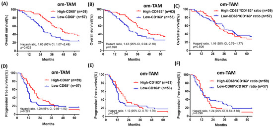Patients with a low density of omental CD68+ or CD163+ om-TAMs had poor OS (median survival: 27 vs. 47 months, HR: 1.63, CI: 1.07–2.49, p = 0.023; 26 vs. 46 months, HR: 1.43, CI: 0.94–2.18, p = 0.098) (Figure 3A,B), but the density of omental CD68+ or CD163+ om-TAMs was not associated with PFS (median survival: 13 vs. 20 months; 13 vs. 18 months, p = 0.225, p = 0.547) (Figure 3D,E). Furthermore, the ratio of omental CD68+/ CD163+ om-TAM was not associated with OS or PFS (p = 0.50, p = 0.299, Figure 3C,F). Overall, we found that neither ovarian tumor densities of ov-CD68+ or CD163+ ov-TAMs nor the ratio of ovarian CD68+/CD163+ ov-TAMs was significantly associated with patient OS or PFS (Table 2, Table 3, Figure S3).