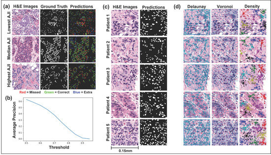 Figure 2 displays the performance of the Mask R-CNN on the testing set (Figure 2a,b) and five representative H&E images from this study’s cohort (Figure 2c). Mask R-CNN achieved a mean Aggregated Jaccard Index (AJI) of 0.53 and a mean average precision (mAP) of 0.31. Furthermore, the network achieved F1, recall, and precision values of 0.65, 0.65, and 0.65, respectively, at an intersection over union (IoU) threshold of 0.5 and 0.40 at an IoU threshold of 0.7. Figure 2a displays the H&E images, ground truth annotations, and color-coded predictions for the lowest, median, and highest-scoring AJI images. The colors are coded such that green represents true-positive pixels, red represents false-negatives pixels, and blue represents false-positives pixels. In a qualitative review of the images, the network tended to over-segment the median and lowest AJI images and often failed to correctly segment nuclei where the image displayed staining irregularities. However, the network performed well in segmenting well-defined nuclei.