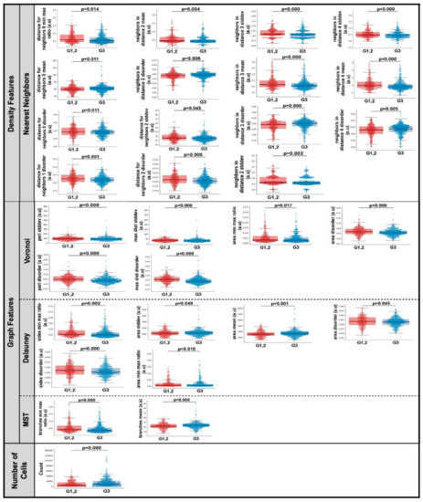Fifty-two computationally derived nuclear spatial features were extracted from each CNB section. Representative features and group distributions are presented in Figure 2d. The centroids of the segmented nuclei were used to extract three categories of spatial features: nuclear density features, nuclear graph features, and nuclear count. In univariate analysis, thirty spatial features were significantly different (p < 0.05) in CNB sections of patients with G1, 2 compared to those with G3 (Figure 3). Of the thirty spatial features, fifteen included nearest neighbor density features, six were Voroni diagram features, six were Delaunay triangulation features, two were MST features, and significantly more nuclei were identified in CNB sections of patients with G3 tumors.