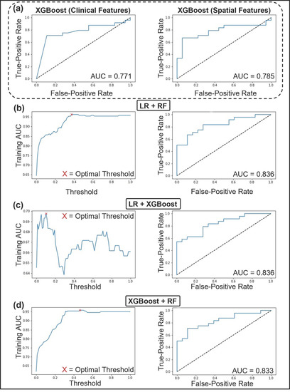 Receiver operating characteristics (ROC) curve and area under the curve (AUC) of the top performing machine learning models trained with clinical and spatial feature sets. (a left) ROC and AUC of XGBoost, the top performing classifier using clinical features. (a right) ROC and AUC of XGBoost, the top performing classifier using spatial features. (b–d) The top three performing ensemble models. (b) AUC vs. Threshold of LR+RF, with an optimal threshold of 37% (left). ROC and AUC of LR+RF (right). (c) AUC vs. Threshold of LR+XGBoost, with an optimal threshold of 10% (left). ROC and AUC of LR+XGBoost (right). (d) AUC vs. Threshold of XGBoost+RF, with an optimal threshold of 46% (left). ROC and AUC of XGBoost+RF (right). Abbreviations: ROC, Receiver Operating Characteristic curve; AUC, Area Under the Curve; LR, Logistic regression; RF, random forest classifier; XGBoost, Extreme Gradient Boost.