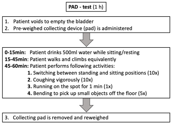 Data regarding perioperative and early continence was ascertained by PAD-test results and the usage of pads in follow-up assessments after RP. The PAD-test was a comprehensible and validated test that measured the amount of involuntary loss of urine while performing predefined physical activities within 1 h. The PAD-test was performed within 24 h after the removal of the transurethral catheter, as previously described [17,21]. Urine loss of <1 g, 1–10 g, 11–50 g, and >50 g was defined as continent, mild incontinent, moderate incontinent, and severe incontinent, respectively (Figure 1). Early continence was defined as the use of no, or one safety-pad within 24 h, whereas a higher number of pads was considered incontinent. Early continence status was based on a voluntary self-reported standardized, established questionnaire [4]. More precisely, data regarding daily pad usage was assessed by evaluating the number of pads used, grouped as ’0–one safety’, ‘1–2’, ‘3–5’, or ‘>5’ pads, respectively. If two follow-up assessments were available within the first six months of post-surgery (n = 3), the more mature assessment (closer to 6 months cut-off) was considered for further analyses.