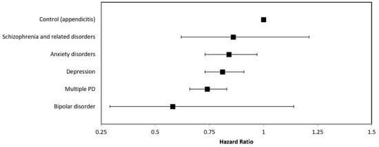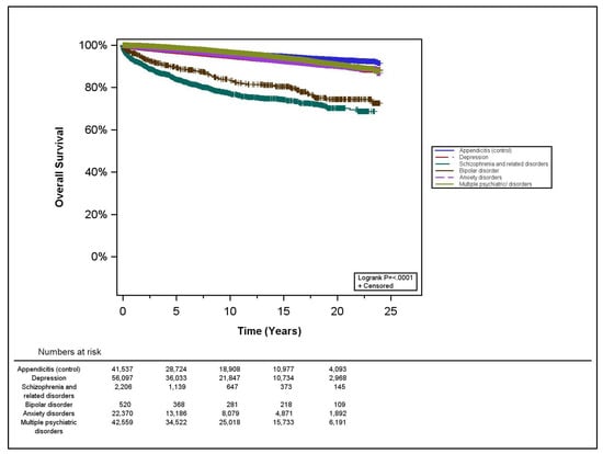 In order to assess whether death should be treated as a competing risk, we first performed our survival analyses. Individuals with PD were 1.37 times more likely to die during the study period than appendicitis patients (95% CI: 1.28–1.48). In our cohort, individuals with schizophrenia and bipolar disorder had the highest percentage of deaths at 19%, while 4% of anxiety patients and 5% of depression patients died during the study (compared to 4% of appendicitis patients) (Table 1). OS was significantly worse among the psychiatric cohorts (p < 0.001) (Figure 1). The 10-year OS rates were 97% for appendicitis, 95% for depression, 79% for schizophrenia, 84% for bipolar disorder, 96% for anxiety disorders, and 97% for multiple PD (p < 0.001). Full 5-, 10-, 15- and 20-year OS information is provided in supplementary Table S1. Table 2 presents the Cox regression analysis assessing the impacts of PD diagnosis on survival. All PD showed significantly worse survival compared to the appendicitis group (HR range = 1.09–6.52; p < 0.001) (Table 2).