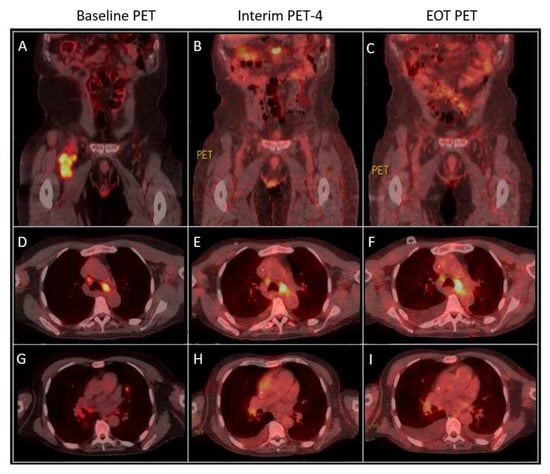 Comparison of baseline, interim, and end-of-treatment (EOT) PET-CT. (A) An abnormal 5.8 × 3.9 cm2 soft tissue mass (SUV 11.9) adjacent to the proximal right femur demonstrates near complete resolution after cycle 4 (SUV 1.68) (B) and complete resolution after cycle 6 (C). (D) Enhancing mediastinal adenopathy (max SUV 13.4, Deauville Score 5) with significant improvement (SUV 9.3, Deauville Score 4) after cycle 4 (E) maintained after cycle 6 (Deauville Score 4) (F). (G) Abnormal FDG uptake of numerous subcentimeter bilateral pulmonary nodules (max SUV 8.4) with complete resolution after cycle 4 (H) and maintained after cycle 6 (I).
