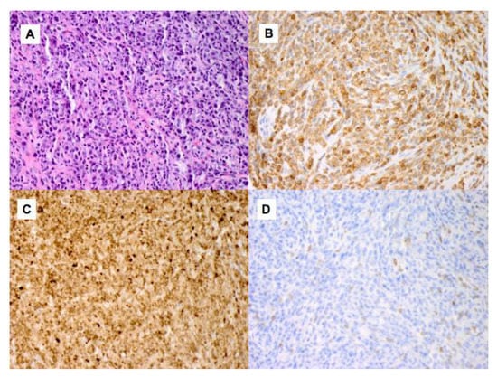 Histologic morphology and immunohistochemical stains on the soft tissue mass. (A) The tumor shows a diffuse infiltration of large, atypical lymphocytes in a fibrohistiocytic background (Hematoxylin and Eosin ×400). The lymphoma cells express CD3 (B), CD30 (30% of lymphocytes) (C) and are negative for CD5 (×400) (D).