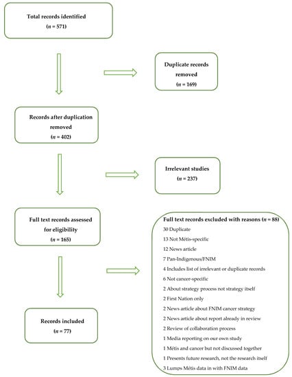 Records were excluded if they discussed Métis populations and cancer separately or if they addressed cancer in Indigenous/First Nation, Inuit, and Métis populations, but the data from each group were lumped together (i.e., reporting findings under the ‘Aboriginal/Métis’ or ‘Indigenous’ category); news articles were also excluded. While ‘future research’ was not on our original exclusion list, we decided to exclude records if they solely proposed future research because the data was not yet available. For records without an abstract, full text copies were collected to screen. Thirteen disputes between the two reviewers were resolved by dialogue, and a final decision was made collaboratively. Figure 1 outlines the screening and selection process; seventy-seven records were included in the review.