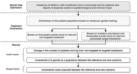 The health and budget impact of adopting alternative TL-LBx-CGP in aNSCLC patients was assessed from a Canadian publicly funded healthcare perspective over a three-year time horizon. An economic model was developed in a Microsoft Excel spreadsheet which estimated the number of patients who could receive targeted therapies rather than non-targeted therapies due to identification of an actionable mutation, and then estimated the incremental population life-years (LYs), and costs associated with funding TL-LBx-CGP (refer to Figure 1). The eligible patient population was modelled using a reference (TL-LBx-CGP, not publicly funded) and new (TL-LBx-CGP, publicly funded) scenario through a two-step process: market size estimation and treatment distribution.