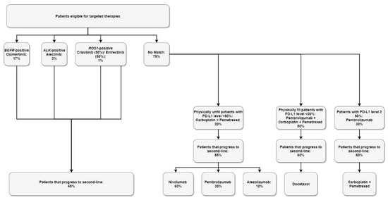 - Gierman, H.J.; Goldfarb, S.; Labrador, M.; Weipert, C.M.; Getty, B.; Skrzypczak, S.M.; Catasus, C.; Carbral, S.; Singaraju, M.; Singleton, N.; et al. Genomic testing and treatment landscape in patients with advanced non-small cell lung cancer (aNSCLC) using real-world data from community oncology practices. J. Clin. Oncol. 2019, 37, 1585. [Google Scholar] [CrossRef]