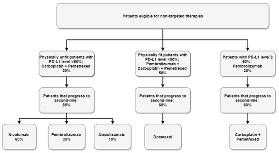 Eligible patients in each scenario receive publicly-funded first-line treatment options based on the likelihood of receiving molecular genetic testing results, and biomarker prevalence rates (Table 3). It was assumed that PD-L1 was tested for all patients. Biomarkers tested in the new scenario are based on the NCCN guidelines for mutations recommended for testing (EGFR, ALK, ROS1, BRAF V600E), as well as the NTRK mutation; however, currently in Canada, there no funded therapies for BRAF or NTRK positive, and thus, those patients were placed in the “no match” arm. The model assumed patients who received molecular genetic testing are eligible for targeted therapies (Figure 3), and patients who received no molecular genetic testing are eligible for non-targeted therapies (Figure 4). Upon progression from first-line treatment, patients are distributed appropriately into approved, publicly funded second-line treatments.