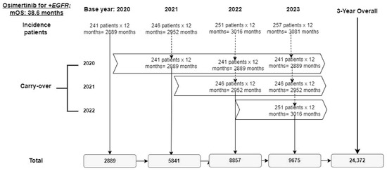 The base case for the health impact was informed by the change in the number of patients moving from non-targeted to targeted therapies, and the associated incremental LYs gained for annual population cohorts over a 3-year time horizon. Change in the number of patients moving from non-targeted therapies to targeted was estimated by monitoring the incident patients distributed into the different types of therapies (chemotherapy, immunotherapy, chemo-immunotherapy, and targeted therapy) per year in the reference versus new scenario. The population LYs in each scenario were calculated by multiplying the number of patients distributed to the respective treatments by the median overall survival (mOS) (Table 4). Carry-over beyond one year was assigned to cohorts receiving treatments with mOS values greater than 12 months. As an exploratory result, the lifetime LYs gained as a population were calculated by carrying-forward all incident patients captured within the 3-year time horizon until the end of their mOS. A sample calculation for incremental population LYs using osimertinib is presented in Figure 5.