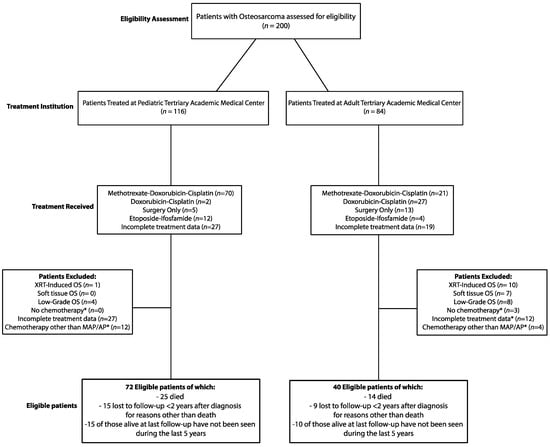 Testa, S.; Hu, B.D.; Saadeh, N.L.; Pribnow, A.; Spunt, S.L.; Charville, G.W.; Bui, N.Q.; Ganjoo, K.N. A Retrospective Comparative Analysis of Outcomes and Prognostic Factors in Adult and Pediatric Patients with Osteosarcoma. Curr. Oncol. 2021, 28, 5304-5317. https://doi.org/10.3390/curroncol28060443