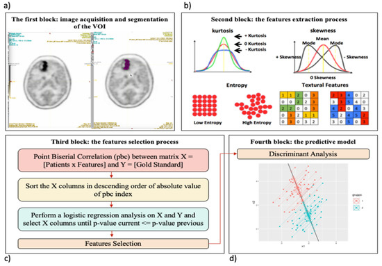 The radiomics workflow of the study. (a) PET image with lesion segmentation based on the thresholding method (see Section 2.1). (b) Some examples of the 44 features extracted using LifeX software, such as kurtosis, skewness, entropy and two textural features in the form of matrix (see Section 2.2), (c) Feature selection using a mixed descriptive-inferential sequential approach (see Section 2.2.3), (d) Representative figure of biplanar feature classification (low and high tumour grade) using the discriminant analysis as the supervised classifier. Specifically, a set of labelled instances (low and high tumour grade) were used for training purpose. Successively, the classifier was used to predict the label in the test set, where instances were without corresponding labels (see Section 2.2.4).