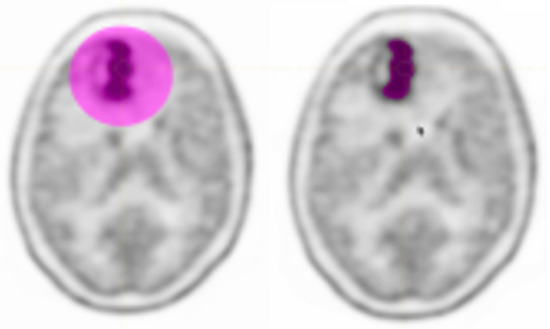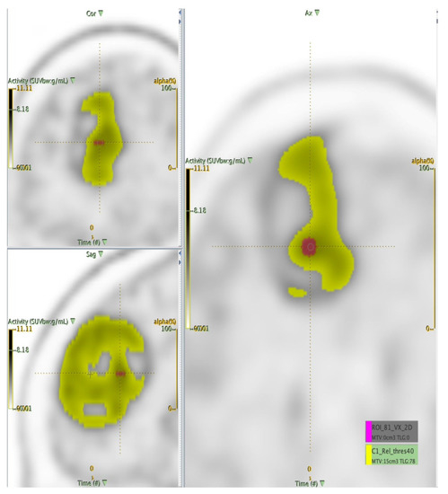 The LIFEx software was used to perform the lesion delineation step in the radiomics workflow. Image pre-processing was adopted to reduce noise, improve image characteristics such as edges, and sample homogenization. As suggested in [35], to obtain more robust results, we resampled using 64 bins between 0 and 20 Standardized Uptake Value (SUV) units (i.e., size bin equal to 0.317) being this one the most frequent SUV range in oncology. For spatial resampling, voxel size remained that of the original images. At this point, the nuclear medicine physicians identified the tumour region and proceed with the delineation. Although manual delineation seems the most intuitive and easily implemented way of obtaining lesion area, it is time-consuming and subject to inter- and intra-observer variability [36]. For this reason, the thresholding segmentation method was used. In the images acquired with 11C-methionine, major structures (brain tumours) were well-distinguished with respect to surrounding tissues and the threshold method was sufficient to identify the lesion area. The area containing the target was localized by the operator and a SUVmax threshold value of 40% [37] was used to identify the volume of interest (VOI), see Figure 2. The user input was minimal and limited at drawing a rough contour around the target to avoid false positives.