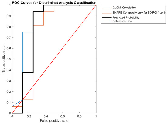 Finally, Table 4 and Table 5 show the performance evaluation in the predictive model obtained using the discriminant analysis (Section 2.2.3). Specifically, considering the fixed ROI, our model was able to predict tumour grade with the best accuracy (~73%, AUC ~ 79%) in the subgroup of patients who underwent Siemens tomography scans, while the worst condition occurred in the whole patients’ dataset (accuracy = 57.25%, AUC = 58.51%). In the same way, considering the VOI, the best model was obtained in the Siemens sub dataset (accuracy ~85%, AUC = ~79%), while the worst was obtained in the whole patients’ dataset (accuracy = 70.31%, AUC = 64.13%).