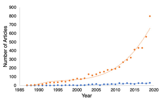 A graph of the number of papers listed in PubMed plotted against the year, which include the terms “cancer, patient, spouse, and caregiver” (orange dots) versus “cancer, patient, spouse and partner” (blue dots). The figure shows that over the last 30 years, reference to spousal “caregivers” has accelerated exponentially, while reference to “partners” has remained nearly flat. The curved lines fitted to the data are 3rd-order polynomials added simply as visual aids.
