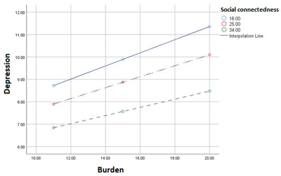 Moderation of the relationship between caregiver burden and depression symptoms when perceived social connectedness is low (18), medium (25), or high (34).
