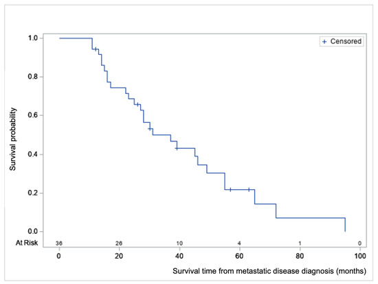 Descriptive statistics were calculated for all variables of interest. Bivariate Cox proportional hazards (PH) models were used to assess the impact of variables on overall survival (OS). A multivariable Cox PH model was run on three variables, which was the maximum allowed given the sample size. Prior to analysis, the variables were assessed for multicollinearity (tolerance statistic < 0.4). No evidence of multicollinearity was found. The bivariate and multivariable survival analysis results were reported as hazard ratios and their associated 95% confidence intervals. Statistical significance was set to p ≤ 0.05. A Kaplan–Meier curve was created for survival from metastatic disease (T0). All analyses were carried out using SAS Version 9.4 (SAS Institute, Cary, NC, USA).