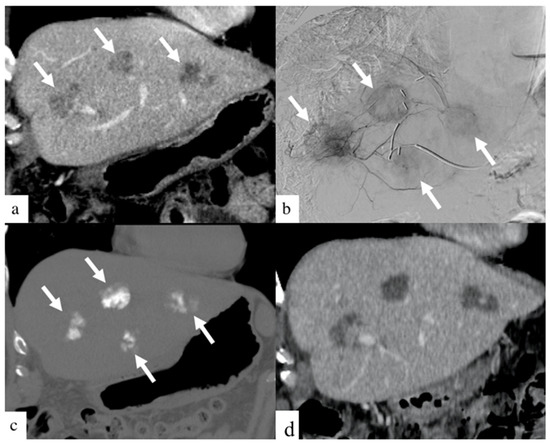 Images of a patient with history of colorectal cancer who underwent a single small particle DEBIRI TACE session of the left lobe. Portal venous phase coronal CT image obtained pre- treatment (a) shows three of the four metastases in the left lobe (arrows). Digital subtraction angiographic images obtained through microcatheter (b) shows hypervascularity of all four metastases (arrows). Non-enhanced coronal CT image obtained 1 h post-treatment (c) shows intra-tumoral staining of iodinated contrast (arrows). Coronal CT image (d) of a patient one- month post-DEBIRI treatment.