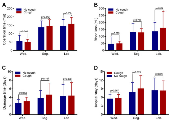 The patients were further analyzed according to type of pulmonary resection (Figure 1). Among the patients who received wedge resection, those with and without postoperative cough were not significantly different in terms of operation time (p = 0.540), blood loss (p = 0.393), postoperative drainage time (p = 0.053), or duration of hospital stay (p = 0.767) (Figure 1). Among the patients who underwent segmentectomy, those with and those without postoperative cough were not significantly different in terms of operation time (p = 0.312), blood loss (p = 0.783), postoperative drainage time (p = 0.107), or duration of hospital stay (p = 0.073). However, among patients who underwent lobectomy, those with postoperative cough had a longer operation time (p = 0.009) and more blood loss (p = 0.034) than the non-cough group, but those with and without postoperative cough were not significantly different in terms of drainage time (p = 0.838) or duration of hospital stay (p = 0.826).