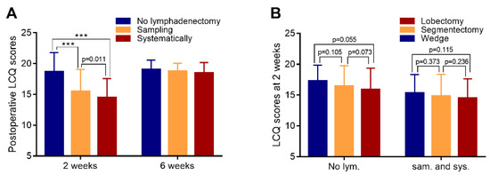 LCQ scores during follow-up. (A) LCQ scores of each subgroup at 2 and 6 weeks after surgery (subgroups were classified according to the lymph node management method). (B) LCQ scores at 2 weeks after surgery (subgroups were classified according to whether lymph node resection was performed). *** denote p < 0.001.