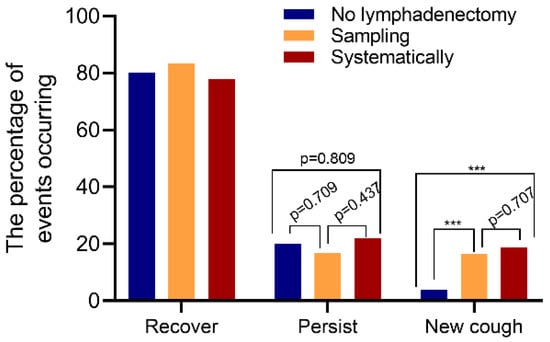 Statistical analysis of the incidence of cough events between groups. There were no differences in the recovery rate of postoperative cough (Left three columns) and no differences in the persist rate of postoperative cough (Middle three columns). In patients with no postoperative cough, the recurrence rate of cough in the no lymphadenectomy group was significantly lower than that in the sampling group and systematic lymph node dissection group (Right three columns). *** denote p < 0.001.