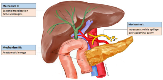 - Cortes, A.; Sauvanet, A.; Bert, F.; Janny, S.; Sockeel, P.; Kianmanesh, R.; Ponsot, P.; Ruszniewski, P.; Belghiti, J. Effect of bile contamination on immediate outcomes after pancreaticoduodenectomy for tumor. J. Am. Coll. Surg. 2006, 202, 93–99. [Google Scholar] [CrossRef]