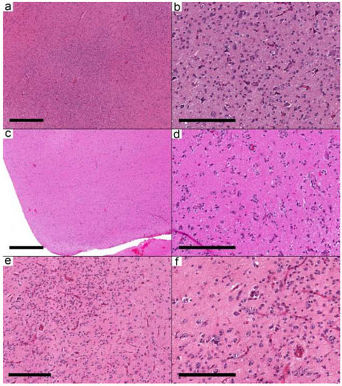 Ganglioglioma with predominant infiltrative pattern. (a–e) Three different cases show similar morphological features. (a,c,e) The cortical areas are involved by a low-moderately cellular neoplasm formed by dysmorphic neurons and oligodendrocyte-like cells. (b,d,f) Oligodendrocyte-like cells are arranged around neurons and blood vessels resembling infiltrative glioma. Cases: (a,b) Case 8; (c,d) Case 9; (e,f) Case 10. Scale bars: 600 µm (a,c); 200 µm (b,d,f); 300 µm (e).