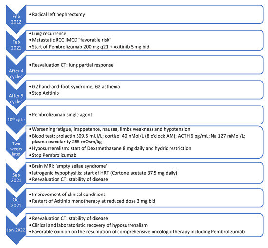 During HRT, the patient has been clinically and laboratory monitored, keeping hold of pembrolizumab. Once established that the symptoms could be attributed to ICI, axitinib has been resumed at a reduced dose of 3 mg bid, and monotherapy was continued for the next three months. Dose reduction was deemed necessary owing to the previous occurrence of severe hand-and-foot syndrome. A subsequent reassessment of a CT scan confirmed stable disease. Cortone acetate has been reduced to 25 mg daily considering clinical stability. The case has been re-examined within our hospital’s multidisciplinary board for immune toxicities and a team composed of medical oncologists and other specialists with expertise in the management of immunotherapy-derived AEs. The shared decision was to resume comprehensive oncologic therapy including pembrolizumab once clinical and laboratory resolution of adrenal insufficiency has been achieved, taking into account the proven effectiveness of the treatment. Figure 3 illustrates the temporal sequence of events that the patient experienced (Figure 3).