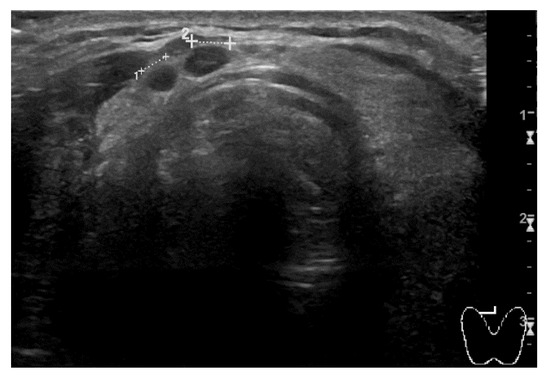 The second clinical case regards a man who was diagnosed with RCC of the left kidney. He first underwent partial nephrectomy in 2015. Two years later, radical nephrectomy was performed due to locoregional recurrence. At the follow-up CT scan of March 2021, right kidney and multiple lung metastases were detected. The prognosis was scored as a ‘favorable risk’ group according to the IMDC algorithm. The patient was 64-year-old at the time and his only significant comorbidities were hypertension and diabetes mellitus type II, both pharmacologically controlled by atenolol, linagliptin, and metformin. The patient was provided with comprehensive information and first-line therapy with three-weekly pembrolizumab 200 mg; axitinib 5 mg bid was promptly started. After two cycles of treatment, blood pressure values were no longer under control with the usual therapy, and the man started complaining about new onset G2 fatigue. Blood pressure control was rapidly achieved by adding amlodipine to the usual therapy and temporarily discontinuing axitinib for one week. Later, the patient noticed a left lateral-cervical swelling area of new appearance. A neck ultrasound (US) examination was performed, and it revealed multiple thyroid nodules consistent with toxic goiter (Figure 4). No thyroid hormone alterations were detected on blood tests, thus no specific action has been necessary.