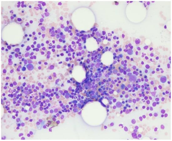 The diagnosis of CLL involves the presence of lymphocytosis (>5000 K) in addition to unique clonal immune phenotypes on peripheral blood flow cytometry. The pathogenesis of CLL involves the continuous activation of CD5+ B cells by genetic mutations, cytogenetic dysfunction, and environmental factors. An important step in the pathogenesis of CLL is the expression of B cell antigen receptor (BCR), which leads to continuous antigen-independent cell-autonomous cell signaling and thus to the production of malignant B lymphocytes (MBLs). The neoplastic B lymphocytes evade apoptosis and, with time, proliferate in the lymph nodes, eventually accumulating in peripheral blood. These MBLs may infiltrate the spleen and bone marrow, leading to splenomegaly and hypercellular bone marrow [].