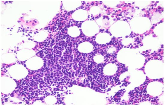 The primary sites of involvement for CLL include peripheral blood, bone marrow, spleen, and lymph nodes []. The pathologic leukemic phase is characterized by the presence of dysfunctional B cell lymphocytes in the peripheral blood smear. The most common clonal immunophenotypic expression seen in flow cytometry for CLL includes CD5, CD19, and CD23, in addition to the expression of one type of immunoglobulin light chain []. High-risk cytogenetic markers using fluorescent in situ hybridization (FISH) on peripheral blood include del17p, del11q, and unmutated immunoglobulin heavy-chain variable genes of the B cell receptor (IGHV). Intermediate-risk prognostic marker includes trisomy 12, and low-risk prognostic factors include 13q and mutated IGHV [,].