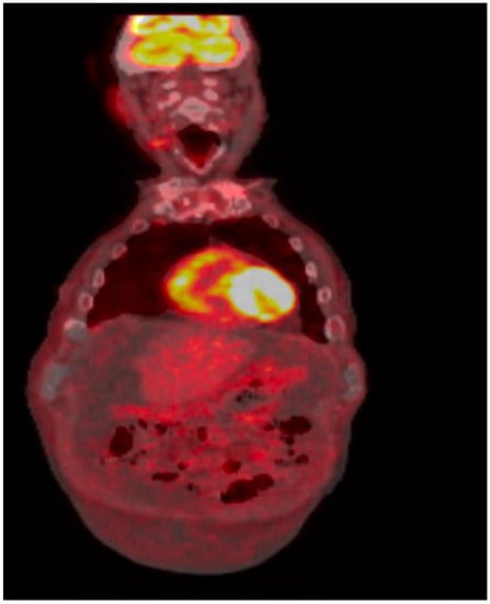 Positron emission tomography/computed tomography showed large ascites with omental caking, exhibiting FDG activity with an SUV maximum of 3.1; it also showed mild fluorodeoxyglucose (FDG)-avid right axillary lymph nodes, but no other evidence of the recurrence of CLL (Figure 4).
