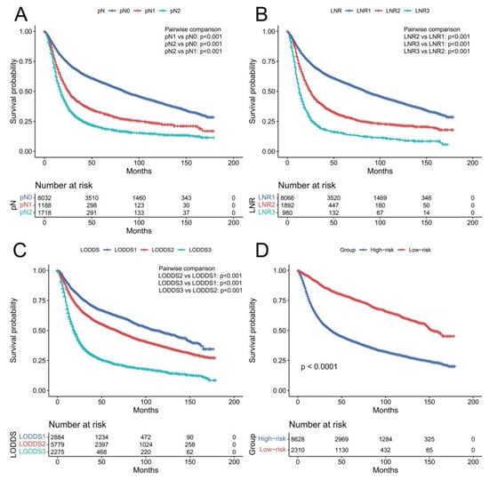 Kaplan–Meier curves of overall survival in the overall cohort according to pN (A), LNR (B), LODDS (C), and risk group (D). pN: pathological N status; LNR: lymph node ratio; LODDS: log odds of positive lymph nodes.