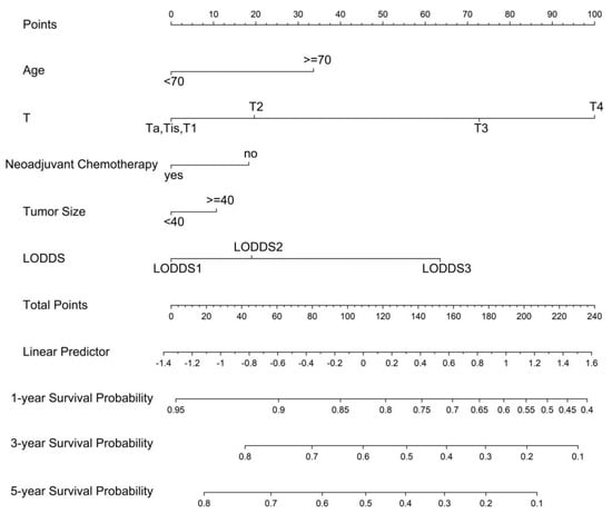 A nomogram to predict 1-, 3-, and 5- year overall survival for non-metastatic bladder cancer after surgical resection. LODDS: log odds of positive lymph nodes.